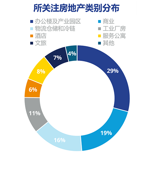 受訪企業中,前三大關注地產類型分別為辦公樓及產業園區、商業、物流倉儲