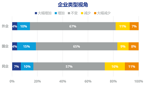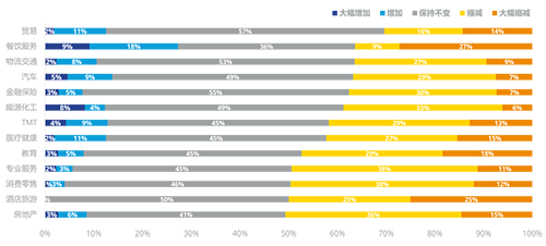 幾乎所有調查中提及的行業,50%以上的受訪者認為所在公司不會減少運營成本的投入。其中,貿易、物流交通、金融保險行業目前受疫情負面影響較;值得注意的是,超過12%的汽車、能源化工、TMT及醫療健康行業受訪者考慮疫情后增加運營投入,為提振市場釋放積極信號。