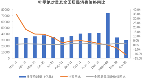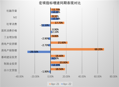 2022年4月整體經濟表現較去年同期有較大差距,顯著走弱。從宏觀數據可以看出,社融存量增速較去年同期的11.7%放緩至10.2%;而M2增速上漲到兩位數,達到10.5%,高于上月和去年同期。消費端來看,由于疫情影響,社零消費額較去年同期相比增速降為負,其中餐飲消費增速降幅明顯,同比下降22.7%;全國居民消費價格則同比上漲2.1%。