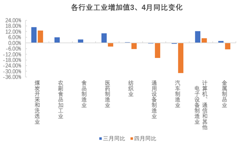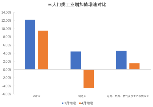 在嚴峻的疫情防控形勢下,國內工業生產增加值由增轉降,同比下降2.9%。三大門類中,采礦業增加值同比增長9.5%,電力、熱力、燃氣及水生產和供應業增長1.5%,較三月相比,增速均有一定程度回落;制造業下滑明顯,同比下降4.6%,增速直接跌為負。