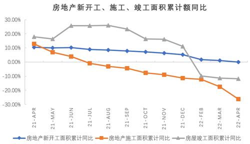 地產投資4月一方面受到疫情影響,開工及銷售受限,另一方面受到市場調控影響,房企拿地謹慎,投資增速持續探底。從相關數據來看,新開工、竣工和施工面積及拿地增速持續下行,降幅擴大。從銷售端來看,1-4月份商品房銷售面積同比下降20.9%,銷售額下降29.5%,跌幅進一步加深。