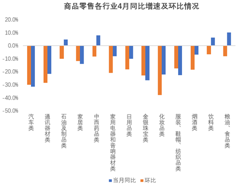 零售行業中,汽車類消費4月同比下降最多,達到了31.8%,值得一提的是近日上海市發布的促進消費舉措是以大宗消費為抓手拉動消費,通過年內新增非營業性客車牌照額度4萬個及對購買電動汽車給予每輛車1萬元的財政補貼來大力促進消費快速恢復,預計這一舉措預計能夠積極刺激汽車消費品市場,5、6月消費規模會有小幅回升。