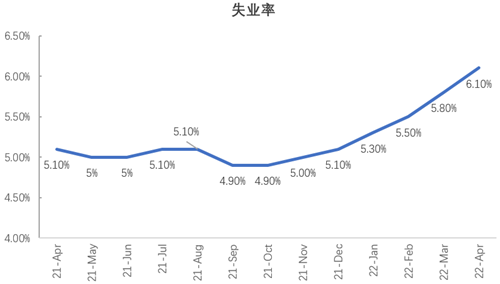 另一方面,失業率從去年10月一路上升,達到4月6.1%,為近一年最高。全球局勢的不穩定,經濟環境日益惡劣,美聯儲75個基點的加息,加之國內受到一波又一波疫情防控影響,企業波折中停工復工,居民收入預期受挫,消費意愿進一步下滑。