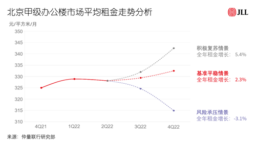 在三種情景下,北京甲級辦公樓市場平均租金將呈現如圖中不同走勢: