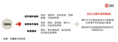 根據仲量聯行研究部的經驗與研究,未來租金走勢的影響因素分為客觀因素和由主觀行動而產生影響的兩大類,其中主觀能動因素約占六成。我們從宏觀端、市場端及項目端梳理出共130+個影響辦公樓市場租金的因素,若積極把握,將此類可主觀調整的因素影響發揮最大化,未來租金走勢將會趨好。