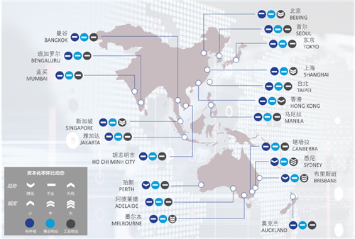 本次報(bào)告共覆蓋20個(gè)關(guān)鍵城市與地區(qū)的三類主要商業(yè)地產(chǎn)投資市場(chǎng),其中8個(gè)城市環(huán)比資本化率有所波動(dòng)。亞太地區(qū)工業(yè)市場(chǎng)的投資需求強(qiáng)勁,資本化率進(jìn)一步下調(diào)。澳大利亞的部分城市寫字樓資本化率有一定下降。