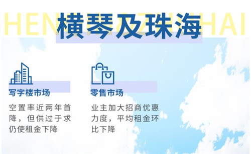 2022年上半年,盡管橫琴及珠海商用物業市場去化壓力猶存,但得益于期內寫字樓及零售市場數個大面積租賃成交的達成,寫字樓市場空置率近兩年首降,零售市場空置率降至近三年最低。