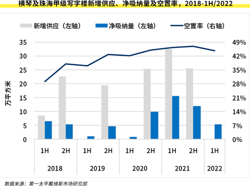 2022上半年,橫琴及珠海寫字樓市場無新增供應入市,市場總存量維持在222.8萬平方米。同期,在數個大宗租賃成交支持下,兩場平均空置率近兩年首度下降,期末錄得44.5%,環比下降2.4個百分點、同比下降1.6個百分點。