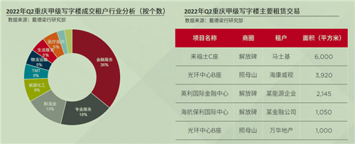 從成交租戶行業(yè)來(lái)看,在重慶加快推進(jìn)西部金融中心建設(shè)的背景下,金融服務(wù)類企業(yè)表現(xiàn)活躍,占總成交的36%;專業(yè)服務(wù)行業(yè)依然是成交主力,以18%的占比排名第二;此外,制造業(yè)錄得多宗大面積成交,比如海康威視(3,920㎡)、小康汽車 (1,200㎡)等。
