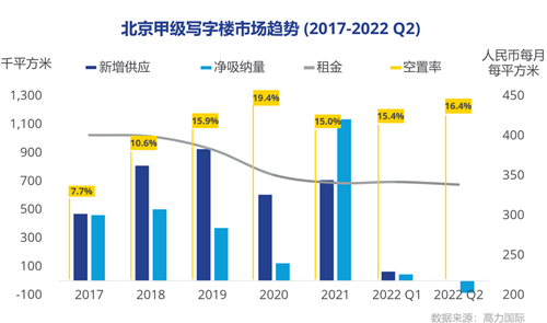 北京甲級寫字樓2022年上半年市場新增需求主要來源于金融類企業(yè)及國企。二季度受到疫情的影響,市場活躍度明顯下降,頭部互聯(lián)網(wǎng)公司的擴張速度明顯放緩,空置率出現(xiàn)了環(huán)比小幅上漲。二季度受到需求放緩的影響,整體市場租金出現(xiàn)小幅下滑。
