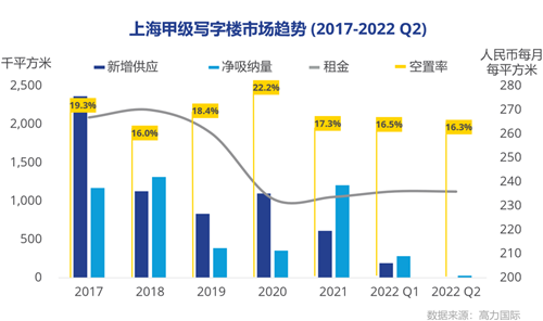 受二季度疫情影響, 2022上半年上海辦公樓市場凈吸納量同比去年同期下降36%。第二季度,上海辦公樓市場成交活躍度大幅放緩,空置率微幅下降,租金持平。上海國有企業(yè)為小微企業(yè)和個體工商戶提供租金減免,企業(yè)對新辦公空間的選擇表現(xiàn)謹慎。