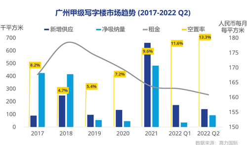 2022年上半年,廣州甲級寫字樓市場整體去化已基本回歸至疫情前水平。除了傳統(tǒng)金融、專業(yè)服務(wù)行業(yè)外,互聯(lián)網(wǎng)科技是市場主要需求來源,上半年完成多個互聯(lián)網(wǎng)科技類大宗租賃成交。廣州甲級寫字樓市場進入新一輪供應(yīng)高峰,部分區(qū)域市場競爭加劇。