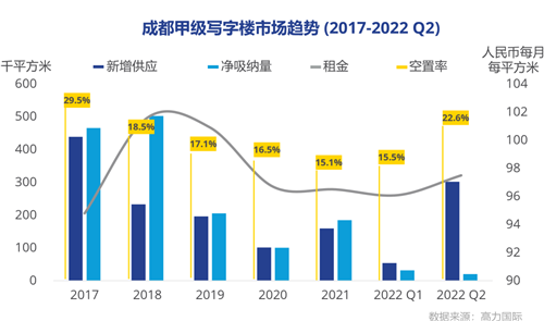 2022年上半年,成都甲級寫字樓市場受國內(nèi)疫情反復(fù)和國際環(huán)境影響,市場需求放緩。第二季度全市迎來供應(yīng)高峰,多個高品質(zhì)甲級寫字樓入市,市場空置率上升,平均租金錄得環(huán)比微降。金融、互聯(lián)網(wǎng)科技及專業(yè)服務(wù)是前三大租賃需求主力。