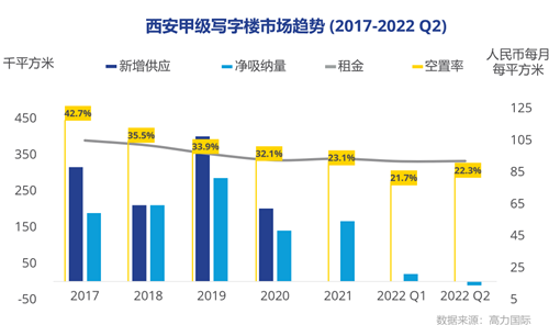 2022年上半年,西安甲級寫字樓市場活躍度降低,整體需求放緩,市場無新增供應(yīng),空置率較上年度末環(huán)比小幅下降,平均凈有效租金環(huán)比微降;ヂ(lián)網(wǎng)科技、專業(yè)服務(wù)及房地產(chǎn)和建筑依然是三大租賃需求主力。