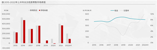 戴德梁行數據顯示,截至二季度末,長沙優(yōu)質零售市場整體空置率10.4%,較2021年末上升3.3個百分點。租金受壓繼續(xù)下行,截至二季度首層平均租金錄得每月每平方米402.2元,較2021年末下降1.6%。