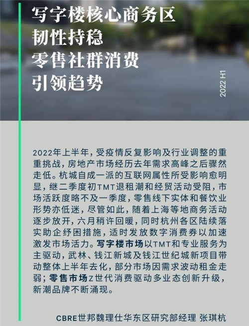 CBRE杭州分公司董事總經理兼戰略顧問部負責人何達表示,2022年,優質項目集中于年中入市,對因疫情反復而整體低迷的零售市場注入強心劑,多樣首店的引入以及貼合Z世代的主題設計為新項目帶來更多可能性。長期來看,如何應對疫情所催化的消費習慣和偏好的改變是開發商和品牌方共同的課題,而年輕消費力將支撐杭州市場多元發展。未來六個月,杭州零售物業市場預計迎來5.5萬平方米的新增供應,聚焦未來科技城板塊,有望持續完善板塊商業布局。與此同時,近日連續發布四個促消費實施細則,繼續發展‘首店經濟’與區域資源實現最優耦合,有望推動消費市場加速回暖。
