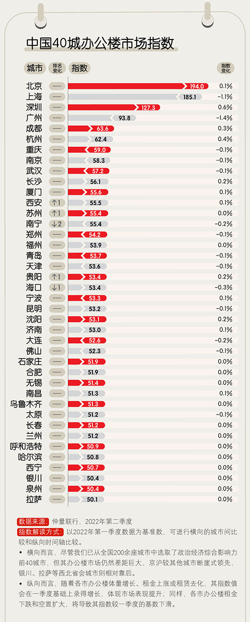1. 排名前10的城市中,城市位次尚無變動(dòng),代表了頭部城市發(fā)展相對(duì)成熟的辦公樓市場結(jié)構(gòu)。其中,上海和廣州的指數(shù)變化較大,分別環(huán)比下降1.1%和1.4%。4月至5月疫情爆發(fā)拖累上海二季度的市場表現(xiàn),廣州則因?yàn)樾枨笙鄬?duì)疲軟加之空置面積走高,市場去化壓力處于高位。北京、深圳、成都、杭州、長沙的指數(shù)變化錄得小幅正增長,表明其應(yīng)對(duì)市場波動(dòng)的內(nèi)生動(dòng)力相對(duì)充足;