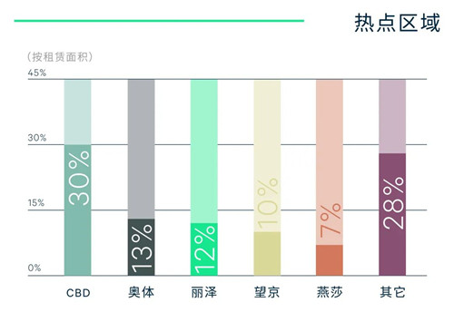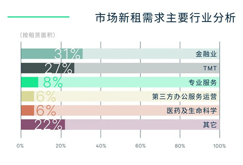 金融和TMT合占新租交易總量的58%,分居前兩大行業(yè),主要集中在軟件開發(fā)、人工智能、產業(yè)數(shù)字化、證券、保險以及資產管理等細分領域,其中金融的擴租需求突出。本季度醫(yī)藥及生命科學行業(yè)新租需求放量明顯,占比進一步攀升。分區(qū)域,CBD和麗澤為新租需求主力釋放區(qū),CBD行業(yè)結構最均衡,麗澤租戶行業(yè)也日漸多元。此外,麗澤、通州和石景山等新興區(qū)域逐步承接更多的跨區(qū)、升級搬遷需求。