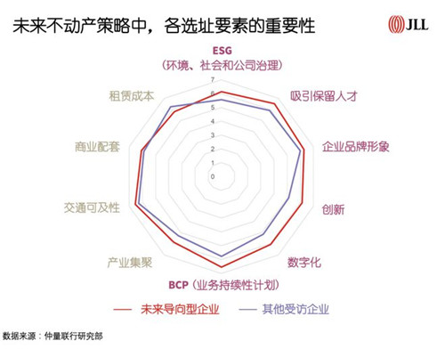 與三年前相比,目前企業在制定不動產選址策略時,除了關注傳統型因素(如租賃成本、交通可及性等)之外,還加大了對包括“ESG(環境、社會和公司治理)、公司品牌、人才保留、BCP(業務持續性計劃)”等戰略型因素的考量。