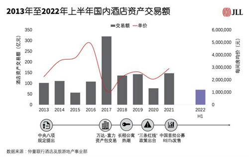 近期中國部分城市新冠疫情反復,導致上半年酒店交易額同比下降43.8%,預計許多酒店交易活動可能推遲到2022年第四季度或2023年第一季度。仲量聯(lián)行數(shù)據(jù)統(tǒng)計顯示,2022年上半年酒店成交額約為70億人民幣,預計2022年,中國酒店交易總額將達到約135億人民幣。