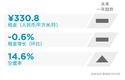 三季度,受經(jīng)濟下行壓力和外部環(huán)境不確定性等多重因素疊加的影響,北京整體寫字樓市場活躍度繼續(xù)下滑,全市季度凈吸納量僅為2.6萬平方米,環(huán)比下降63.8%。整體市場空置率環(huán)比上升0.8個百分點至14.6%。放緩的租賃市場成交令北京全市租金水平繼續(xù)小幅下滑,環(huán)比微降0.6%至每月每平方米人民幣330.78元。