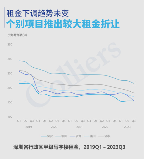 回顧2023年第三季度深圳寫字樓市場表現(xiàn),累積的需求逐步釋放,全市甲級寫字樓吸納量反彈至去年以來最高值;具有獨(dú)特競爭優(yōu)勢的區(qū)域標(biāo)桿型項(xiàng)目更受市場青睞,新入市項(xiàng)目的預(yù)租及自用亦有力支撐了吸納表現(xiàn)。而租金仍然延續(xù)下行趨勢,其中,標(biāo)桿型優(yōu)質(zhì)存量項(xiàng)目的降價(jià)舉措多帶來較好的去化效果。在新供應(yīng)項(xiàng)目空置面積較高的影響下,全市空置率上升至24.3%。