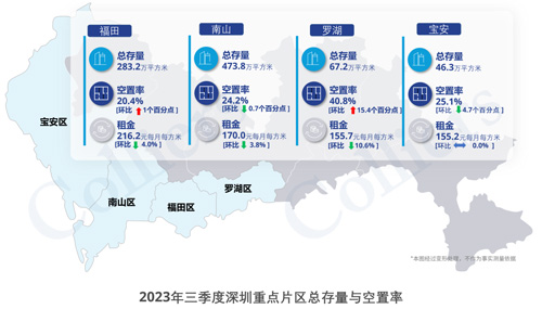 本季度新入市項(xiàng)目共三個,總面積約28.9萬平方米,分布于前海及羅湖,全市甲級寫字樓存量上升至870.4萬平方米,不乏個別項(xiàng)目取得了較好的預(yù)租效果。多種因素帶來的延期使得四季度預(yù)期新供應(yīng)量近70萬平方米,競爭壓力極大。