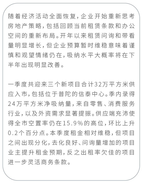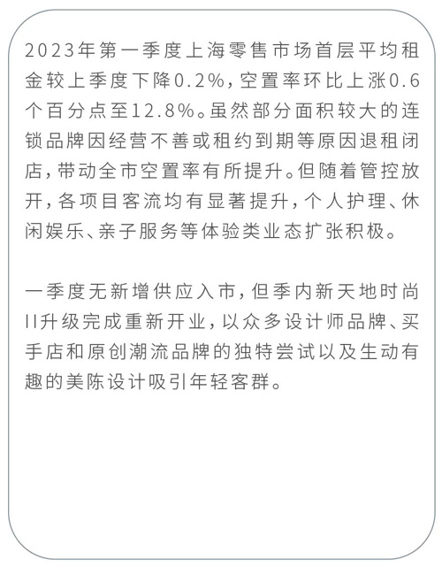 隨著清零政策取消,租賃問詢明顯增加。企業希望通過評估實際情況以制定未來計劃,并采取擴張、搬遷或削減成本的措施。情緒回升、銷售回暖及政府支持也鼓舞了零售商,但反映在吸納量及出租率改善上還需要時間,或在下半年才能有更為顯著表現。雖有新增供應推高空置率,但物流需求仍保持穩定。而受到季節性因素和就業群體返滬利好影響,住宅租賃市場較為活躍。