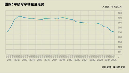 第二季度,北京甲級寫字樓租金環比下降1.6%至每月每平方米人民幣233.1元,比2024年四季度下降了7.4%,今年前兩個季度跌幅持續收窄。