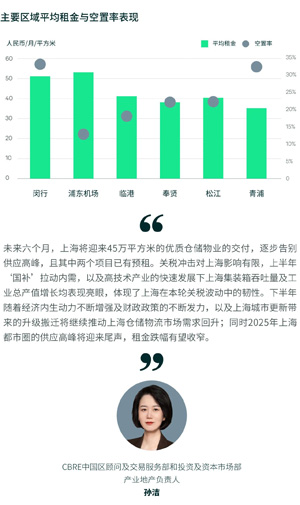 無懼關稅波動,上海工業總產值及消費穩步增長,在“以價換量”刺激下倉儲市場迎來近36.4萬平方米的凈吸納,上半年凈吸納量達到53萬平方米。空置率較高的青浦和金山通過極具競爭力的租金在環滬市場中贏得客戶青睞,在本季度分別錄得超過10萬平方米的凈吸納,包括“618促銷活動“疊加“以舊換新”國補政策推動的快遞快運及供應鏈物流的擴張,此外還包括某知名汽車制造商在金山新租為代表的制造業企業擴張。松江本季亦表現搶眼,靠近市中心的九亭及泗涇板塊以及靠近金山的石湖蕩板塊均有所去化。另一方面,核心市場如閔行和浦東機場由于租金較高,呈現租戶凈流出,空置率接連攀升。