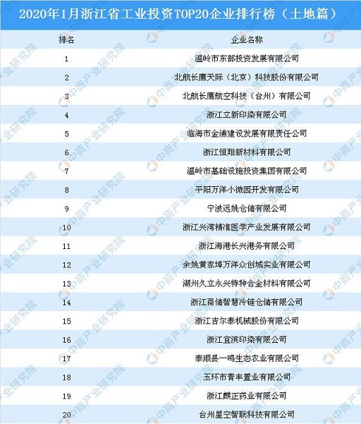 據中商產業研究院產業地產情報庫監測數據顯示:2020年1月浙江省工業投資TOP20企業排行榜已揭曉。據榜單顯示,1月浙江工業投資前十企業分別為:溫嶺市東部投資發展有限公司、北航長鷹天際(北京)科技股份有限公司、北航長鷹航空科技(臺州)有限公司、浙江立新印染有限公司、臨海市金浦建設發展有限責任公司、浙江恒翔新材料有限公司、溫嶺市基礎設施投資集團有限公司、平陽萬洋小微園開發有限公司、寧波遠姚倉儲有限公司以及浙江興灣精準醫學產業發展有限公司。其中,溫嶺市東部投資發展有限公司工業投資最活躍,1月其工業用地拿地面積排名第一。以下是2020年1月浙江省工業投資TOP20企業詳細排名情況: