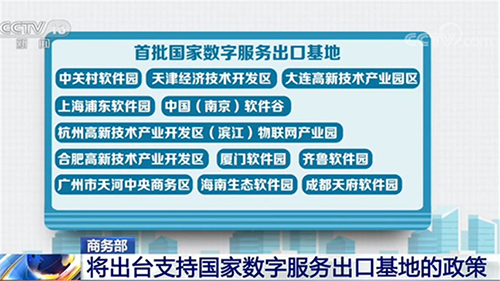 據悉,去年7月,商務部等三部門聯合啟動國家數字服務出口基地創建工作,認定中關村軟件園、天津經濟技術開發區、大連高新技術產業園區、上海浦東軟件園、中國(南京)軟件谷、杭州高新技術產業開發區(濱江)物聯網產業園、合肥高新技術產業開發區、廈門軟件園、齊魯軟件園、廣州市天河中央商務區、海南生態軟件園、成都天府軟件園12個園區為首批國家數字服務出口基地。