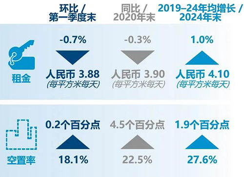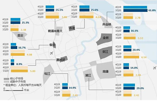 2020年第一季度,疫情的爆發給不少租戶的業務發展帶來負面影響,導致其推遲擴租計劃甚至縮小租賃面積,上海產業園區也因此出現負吸納量,租金亦小幅下跌。