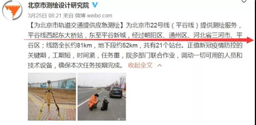 燕郊地鐵最新消息,根據北京市測繪設計研究院官方微博爆料,平谷線前期的測繪工作已經全部上交,取得階段性勝利!如下: