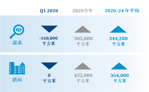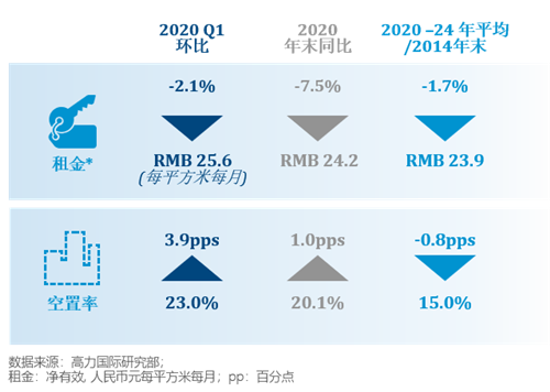 截至一季度末,受部分大面積租戶退租和新需求被推遲影響,全市凈吸納量錄得負(fù)值,整體空置率環(huán)比上升3個(gè)百分點(diǎn)至23%。