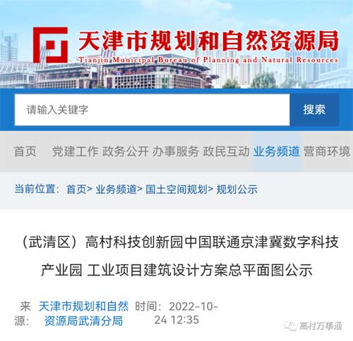 10月24日,天津市規劃和自然資源局武清分局按照住房城鄉建設部印發的《關于城鄉規劃公開公示的規定》以及相關規定要求,公示建設項目 高村科技創新園中國聯通京津冀數字科技產業園工業項目建筑設計方案。公示期限自信息發布起7個工作日。