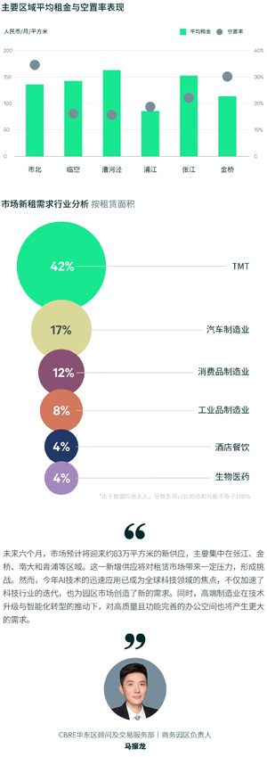 上半年凈吸納量為159,886平方米,環同比均呈現溫和增長趨勢。在行業需求方面,TMT行業以41%的比重占租賃需求首位,其中ABCD信息技術特別活躍,同時AI賦能半導體行業,推動智能制造的發展,帶來上下游企業的擴張,再者AI與BI深度結合帶動更多軟件開發企業的搬遷。其次是汽車制造占比17%,除了新能源汽車的積極拓址,也看到傳統制造加大研發投入,如江淮汽車在金橋設立設計研發中心,江淮汽車是蔚來的代工工廠,現與華為合作研發制造高端新能源汽車。消費品制造業以12%的占比位列第三,主要趨勢為快銷品、紡織與美妝企業的搬遷。總體來看,上半年TMT及高端制造業的需求顯現出良好的發展勢頭,這表明在技術持續演進的背景下,新舊行業的活力交織,為市場注入了新的需求。