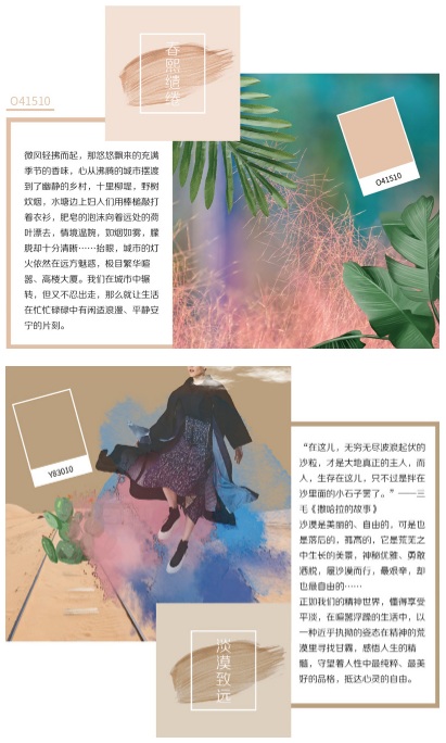 同時,今年的色彩趨勢我們回歸人本身,關照感情與情緒,從生生不息的自然與相互關聯的附近中發現價值,在跨界領域里發現精彩并融合,通過紛繁復雜的時代,發掘其中的多樣性。