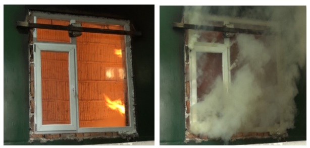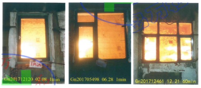 (青島萬和測試塑鋼耐火節能窗耐火試驗中1min和3min背火面煙霧變化,經多次試驗結果均未合格)