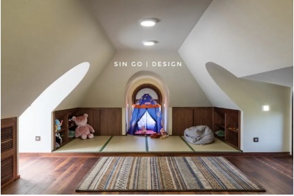考慮到業主家里有孩子的情況,李老師在頂層為小朋友設計了一個秘密基地,簡直就是孩子們的攀爬天堂!小朋友在頂層,有了自己的私密空間,兩側架子上放著所有他自己的玩具和物件,這樣一個小基地誰能不愛呢?