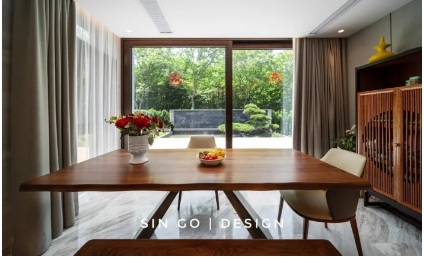 餐桌的旁邊便是茶室,飯后與家人朋友的喝茶聊天是多么愜意與舒適啊!大大的落地推拉門接收著外部溫暖的午后陽光,連接的是房子的花園,打開窗門就能一覽芳華,就如位于花園中。
