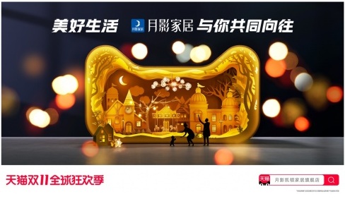 紙雕燈獨(dú)到的構(gòu)圖設(shè)計(jì)匠心從每個(gè)細(xì)節(jié)透露出月影家居的品牌愿景以及對美好生活的理解。在家居家裝行業(yè)燈飾類目中,作為唯一成功入選2021年度天貓雙十一聯(lián)合傳播的頭部品牌,月影家居將天貓形象標(biāo)識(shí)——貓頭造型融入整體框架設(shè)計(jì)之中,用以致敬新零售的電商創(chuàng)業(yè)和奮斗精神,同時(shí)不斷強(qiáng)化國民對其天貓頭部品牌的認(rèn)知記憶。在貓頭框架內(nèi),綠樹環(huán)繞、風(fēng)車搖曳、并配有旋轉(zhuǎn)木馬的歐式家園作為整體背景,以講述全銅燈具所流淌的西方文明血脈淵源。房前,一家三口歡愉互動(dòng)的場景勾勒出人們對美好精致生活的向往和追求。天幕上的月亮、云朵、星光和月影家居標(biāo)志性的全銅吊燈則強(qiáng)化出月影的品牌印跡和產(chǎn)品力。