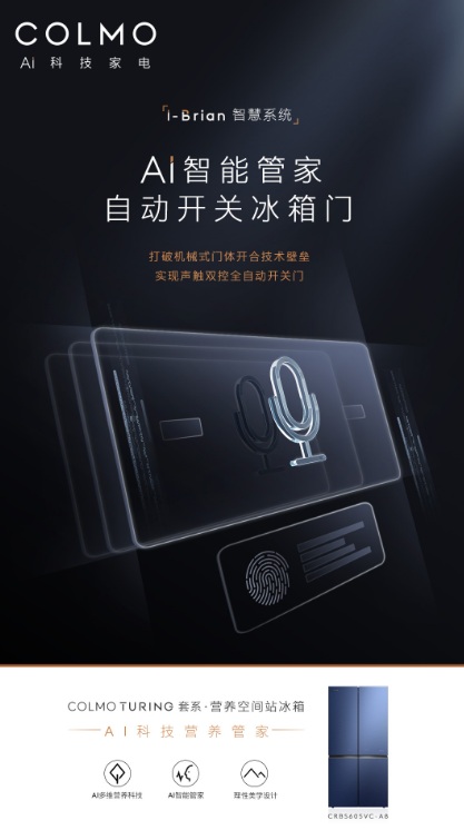 這臺COLMO全自動開關門冰箱也就是COLMO TURING套系··營養空間站冰箱,通過打造AI智能科技,賦予冰箱無窮的想象力。通過AI智能管家,完美實現AI聲觸雙控全自動開關門,是行業當中首次突破技術壁壘實現聲觸雙控開關門。只需輕輕一說,或者簡單一按,就可以實現自動開關門,再也不是只用手才可以開門的基本操作。