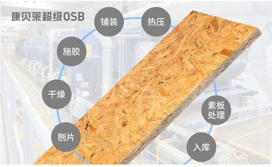 木材是大自然饋贈的天然材料,康貝萊超級OSB采用一體化工廠生產(chǎn),最大化地利用這些原木材料。優(yōu)質(zhì)的原木通過專用設(shè)備加工成長長的刨片(一般為40-100mm長、5-20 mm寬、0.3-0.7 mm厚),經(jīng)脫油、干燥、施膠、定向鋪裝、熱壓成型等工藝制成的一種定向結(jié)構(gòu)板材,生產(chǎn)全程不添加甲醛,成品健康環(huán)保、物理性能強。