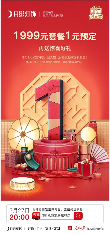 月影家居重磅推出的1999全銅燈具全屋套餐,擁有獨特匠心品質,關注月影直播間下單還能獲得超值好禮。拍付1元預定特權,到天貓【月影凱頓家居旗艦店】購買1999元全銅燈具全屋套餐,可獲驚喜贈品。