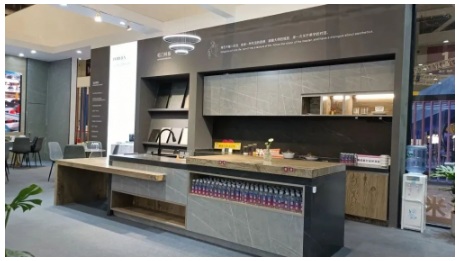 全巖家居定制館主要體現:第一個是新,第二個是全,第三個是個性化。實現家居全案輸出,引領潮流、追求個性化與品質生活的心理與消費需求,展館內能看到大幅面的巖板背景墻,整體廚房、衣柜,巖板不止運用于家居空間各種需求,還有移動家具如餐桌、電視柜等等。