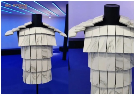 展會現場用人造石搭建而成的“魔方”,既是休憩石凳,又是石藝秀場,新穎別致吸人眼球。用巖板制作的戰士鎧甲,以創意設計賦予石材新的生命力。