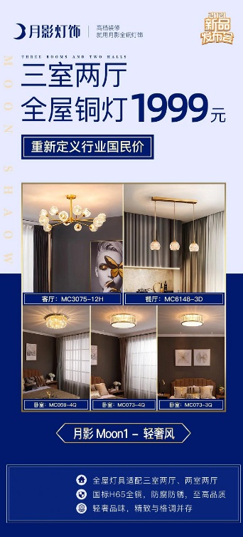 月影家居此次推出的1999全屋銅燈套餐包含輕奢、北歐、歐式、美式、現代、國潮風等六大風格,這是由設計師精選搭配的,是匹配家居裝修主流需求,是消費者燈飾搭配的不二之選。