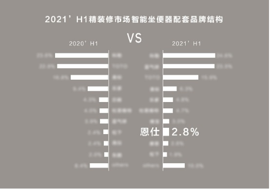 據報告中顯示,2021年上半年地產精裝市場的智能坐便器配套項目同比上升了46.3%,配套規模同比上升41.4%。衛浴產品的智能化升級已經成為家居行業的大勢所趨,國人對于智能衛浴產品的需求也在不斷擴大。據悉,主打智能衛浴產品的恩仕在全球已有近千家門店,并成功實現國內一、二線城市全覆蓋。而作為高端衛浴行業中的新銳品牌,無論在產品的功能性、設計感、還是用戶服務體驗上,恩仕的競爭優勢都讓其迅速成為行業焦點。