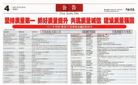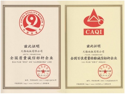 既有高品質產品為基礎,又有高標準服務提供保障,正因如此,天格才能在眾多建材品牌中脫穎而出,贏得消費者信任,成就良好的市場口碑。而在中國質量檢驗協會嚴苛的評選審核中,天格地板繼2019年后,再度獲得諸如“全過質量信得過產品”“全國地板行業質量領先品牌””全國質量誠信標桿企業”等權威榮譽,并與小米科技、中國黃金、李寧體育等具有良好質量示范作用的知名品牌,共同發起《2021年全國“質量月”企業質量誠信倡議書》,彰顯行業領導者的責任感。